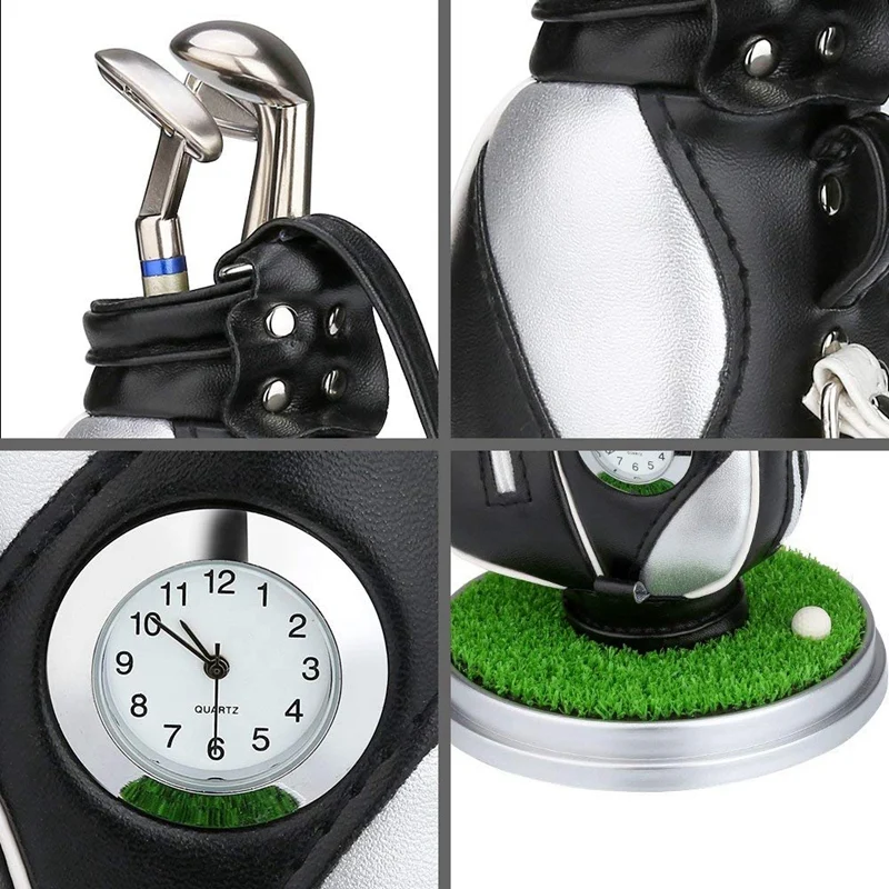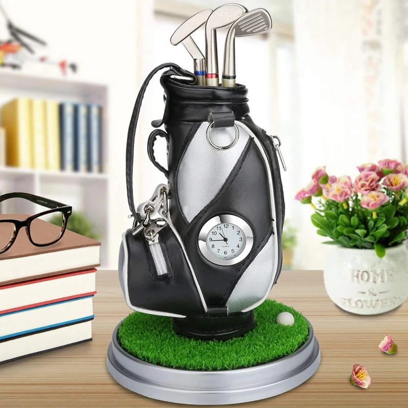 Mini Desktop Aluminum Alloy Golf Bag Pen Holder with Golf Pens Clock Set of Golf Souvenir Novelty G